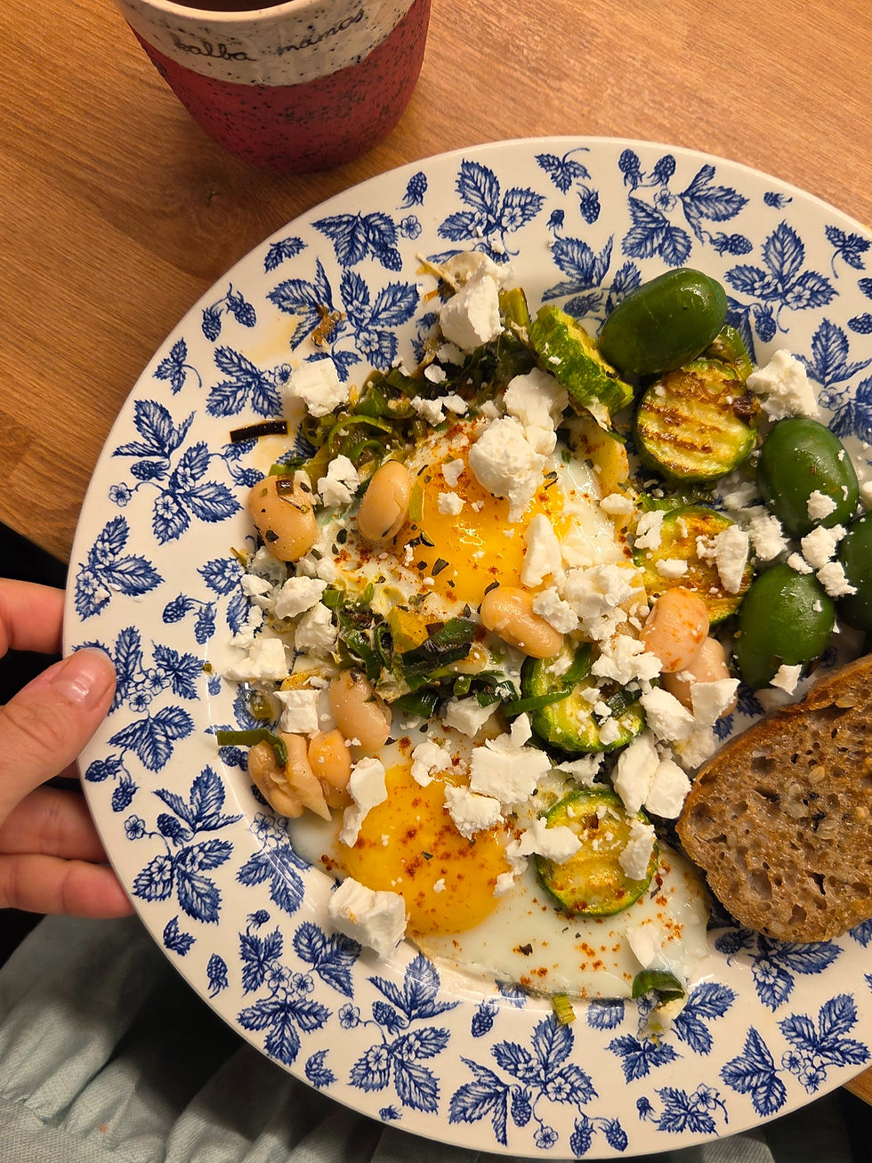 Šakšuka su pupelėmis, pakepta cukinija ir poras, alyvuogėmis, feta, raugo duona.